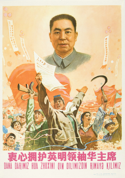 translated: Portrait of Hua Guofeng above a celebrating crowd, including minority peoples. A worker holds up a copy of Renmin Ribao, People's Daily newspaper, while a peasant woman holds a sickle, and a soldier a rifle. The slogan is in Chinese characters and a romanized version of Uigher script.